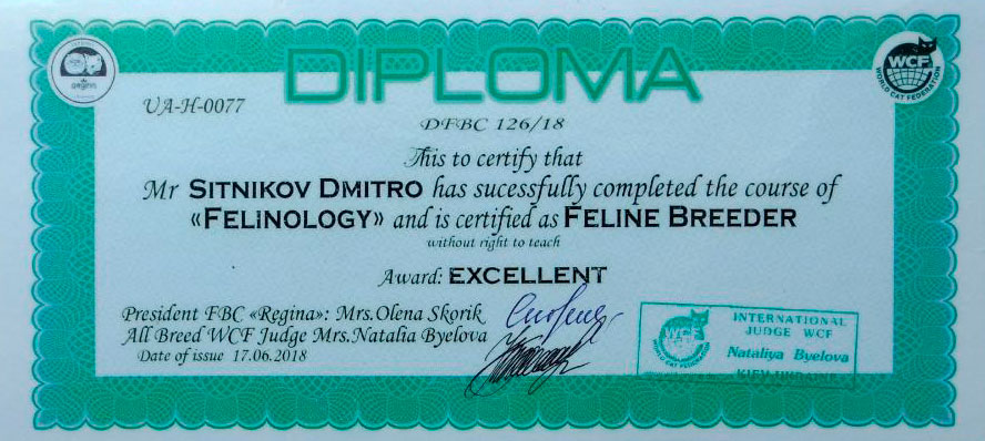 We pay much attention to the health of our pets. Therefore, their diet consists of super premium professional cat food, as well as dairy veal and cottage cheese. Also, nutrition is supplemented with vitamins.